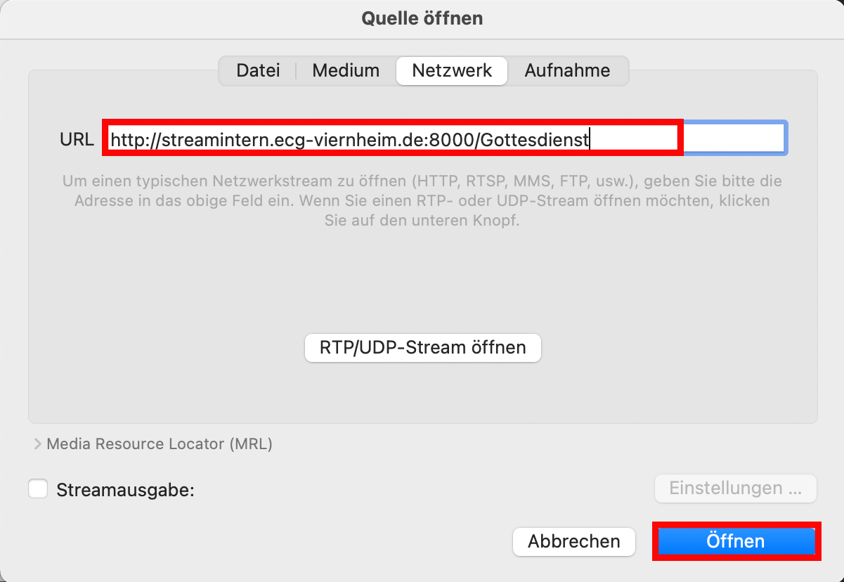 3. Oben im Eingabefeld gibt ihr "http://streamintern.ecg-viernheim.de:8000/Gottesdienst" ein und dann auf "Öffnen". |