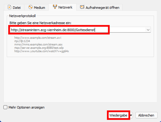 3. Oben im Eingabefeld gibt ihr "http://streamintern.ecg-viernheim.de:8000/Gottesdienst" ein und dann auf "Wiedergabe". |
